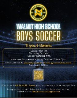 WHS Boys Soccer Tryouts Oct 7, Oct 9 and Oct 14