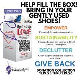 NTHS Collecting gently used shoes - donation box near B13 or the Career Center